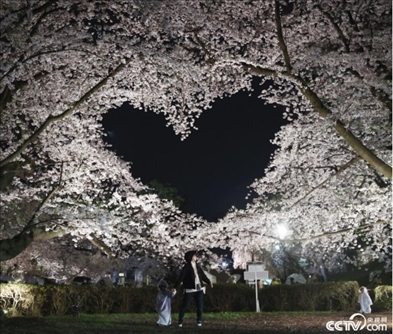 當?shù)貢r間4月15日,日本青森縣弘前市弘前公園的櫻花進入盛開季。其中,有兩株盛開的櫻花樹枝相互交織,在空中形成了一個愛心形狀,成為熱門觀光景點。
