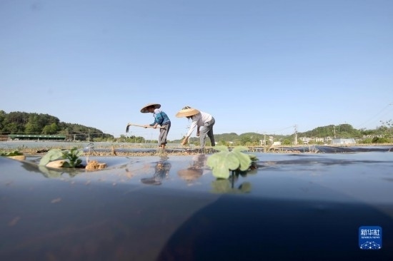 4月16日,在貴州省銅仁市玉屏侗族自治縣新店鎮(zhèn)沙水坪村,村民在西瓜地里蓋膜。