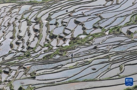 4月16日,在貴州省黔東南苗族侗族自治州從江縣加榜鄉(xiāng)黨扭村,村民從梯田上走過。