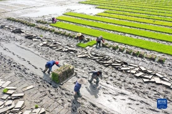 4月16日,在浙江省樂清市城東街道的一片秧田里,農民在搬運秧苗(無人機照片)。