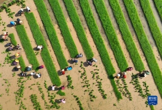 4月16日,在湖南省衡陽市祁東縣金橋鎮(zhèn),村民在扯秧(無人機照片)。