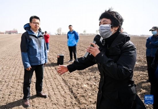 4月17日,在通遼市科爾沁左翼中旗腰林毛都鎮(zhèn),科爾沁左翼中旗農技推廣中心主任梅園雪向種植戶推廣介紹密植滴灌高產技術。