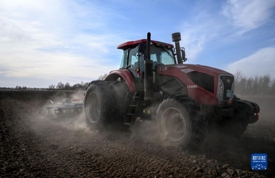 4月12日,在通遼市科爾沁左翼中旗腰林毛都鎮(zhèn),農機在田間整地。