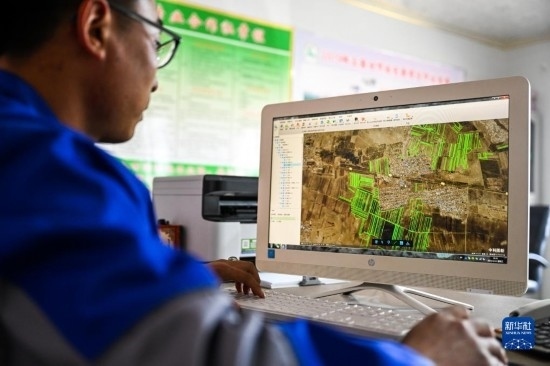 4月12日,在通遼市科爾沁左翼中旗腰林毛都鎮(zhèn),一家農業(yè)合作社的負責人查看今年耕種的衛(wèi)星地圖。