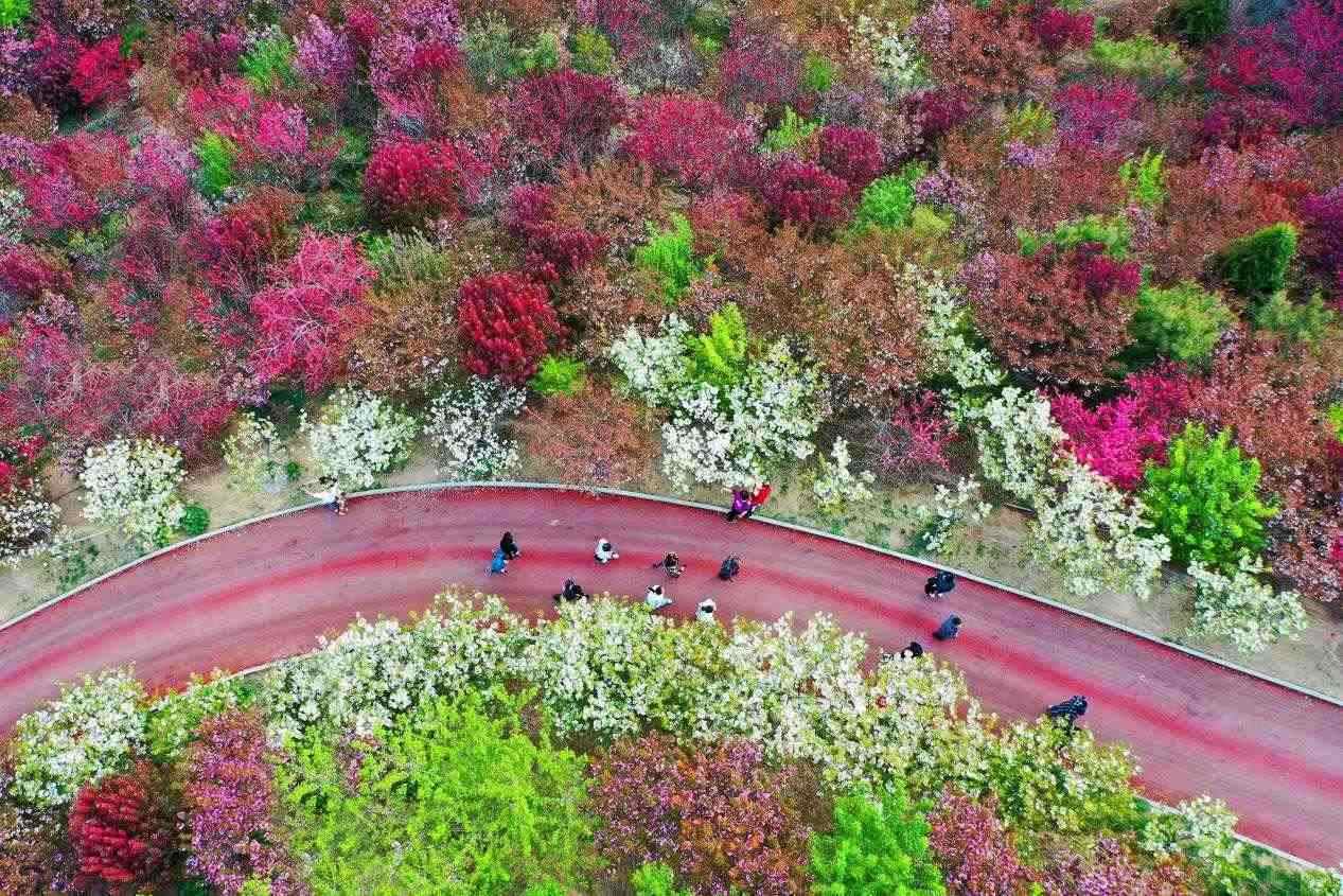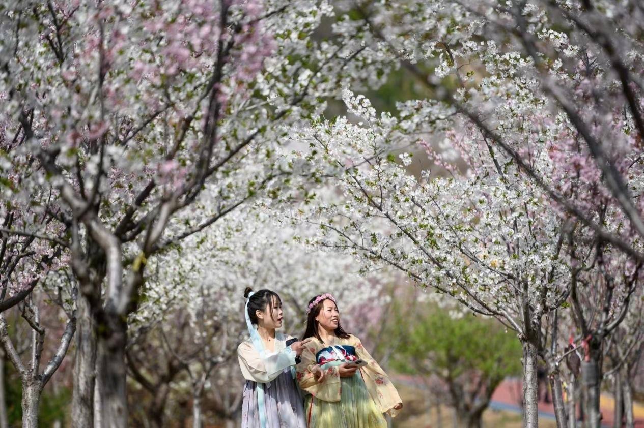 櫻花園里,各類櫻花搖曳生姿,爭相怒放,景色宜人,構成一幅幅明麗的春日畫圖。前來觀賞的游客紛紛在櫻花樹下拍照打卡。