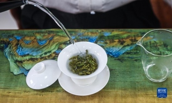 4月19日,茶藝師在沖泡婺州舉巖茶。