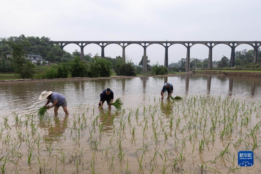 4月25日,在瀘縣奇峰鎮(zhèn)陽(yáng)高村,村民在勝利渡槽附近的水田里插秧。
