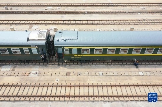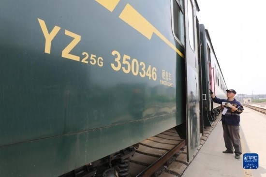 4月28日,中國鐵路上海局集團有限公司徐州站的鐵路連結(jié)員在對臨時旅客列車進行拉風作業(yè)(無人機照片)。