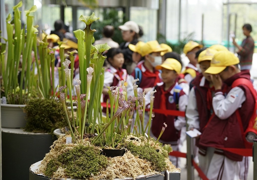 4月27日,學(xué)生們?cè)趪?guó)家植物園溫室參觀瓶子草。新華社記者 李欣 攝