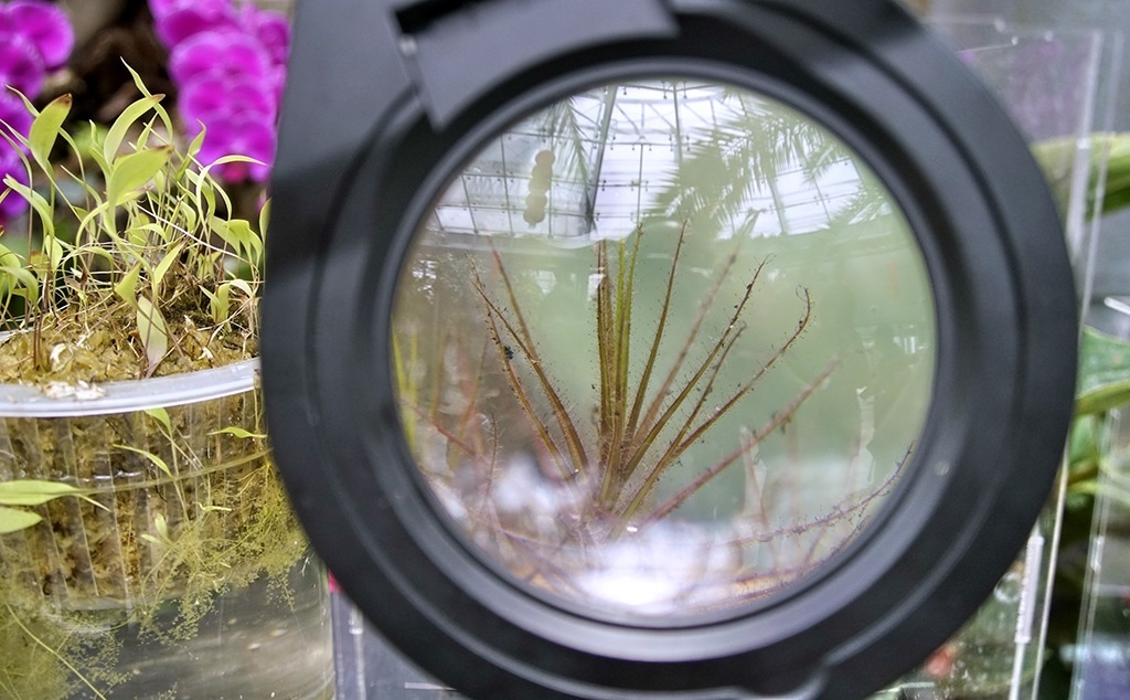 這是4月27日在國(guó)家植物園溫室內(nèi)透過(guò)放大鏡拍攝的美杜莎捕蟲(chóng)樹(shù)。新華社記者 李欣 攝