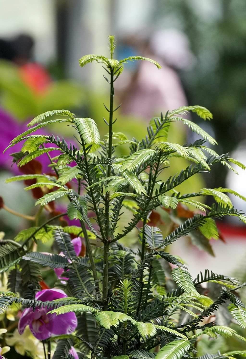 這是4月27日在國(guó)家植物園溫室內(nèi)拍攝的蓖子三尖杉。新華社記者 李欣 攝