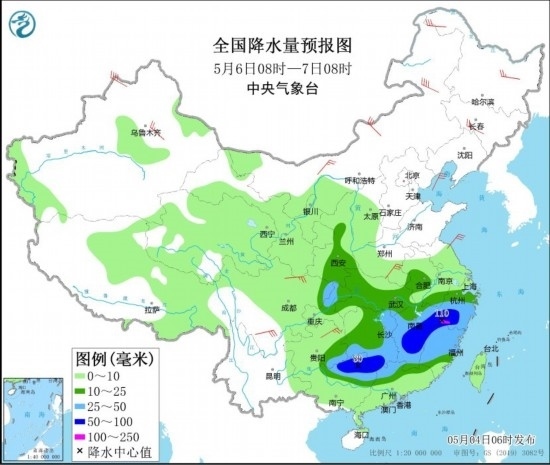 5月6日08時至7日08時,陜西中南部、江漢大部、江淮西部、江南、西南地區(qū)東北部、華南北部等地部分地區(qū)有中到大雨,其中,湖南南部、江西中部和東北部、浙江西南部、福建西北部、廣西北部等地部分地區(qū)有暴雨或大暴雨(100~110毫米)。內蒙古中部和西北部、黑龍江東北部、吉林中部、新疆沿天山地區(qū)、河南南部、四川盆地西北部、四川南部、貴州東北部等地部分地區(qū)有4~6級風,其中,內蒙古東北部、新疆北疆北部等地部分地區(qū)有6~7級風。