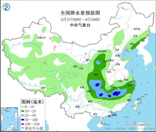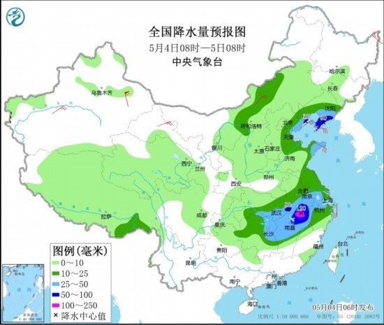 5月4日08時至5日08時,湖北南部和東部、安徽南部、湖南東北部、江西中北部、浙江西部、江蘇南部以及山東半島、遼寧南部、河北東部等地部分地區(qū)有大到暴雨,其中,安徽南部、江西北部等地部分地區(qū)有大暴雨(100~120毫米)。上述部分地區(qū)伴有短時強降水(最大小時降雨量20~40毫米,局地可超過50毫米),局地有雷暴大風等強對流天氣。內蒙古中部、黑龍江東北部、新疆南疆盆地、甘肅河西、山東半島等地部分地區(qū)有4~6級風,其中,新疆東部部分地區(qū)有8~9級風。渤海、渤海海峽、黃海大部、東海北部海域將有7~8級、陣風9~10級的大風。