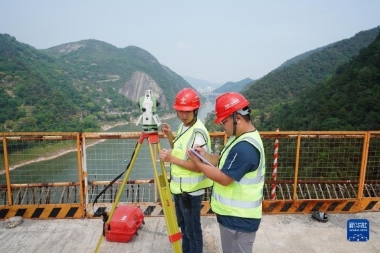 5月4日,在重慶市北碚區(qū)渝武高速復(fù)線觀音峽嘉陵江特大橋,中交一公局四公司橋梁工區(qū)工作人員孫培耕(右)和彭昭屏在對橋面高程及軸線偏位進行測量。