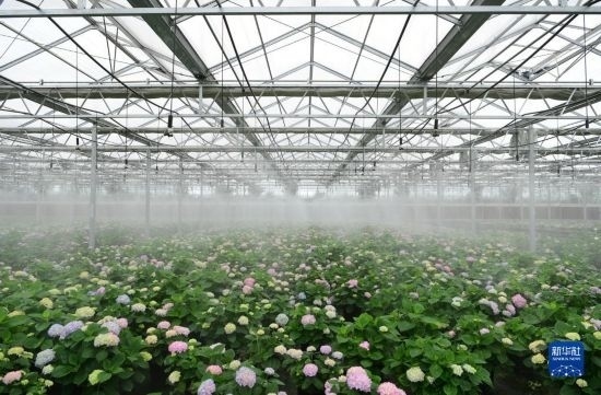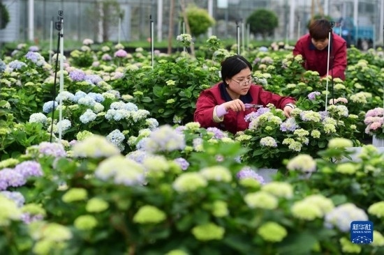 5月5日,在肥西縣經(jīng)開(kāi)區(qū)一家農(nóng)林科技企業(yè),員工在花卉種植基地打理繡球花。
