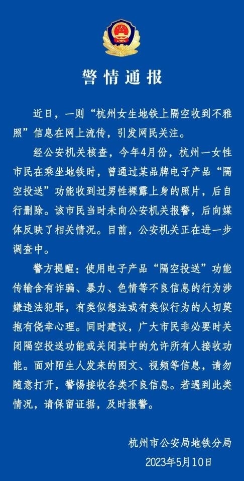 ·杭州一女子地鐵上隔空收到不雅照,警方回應:正在進一步調(diào)查。