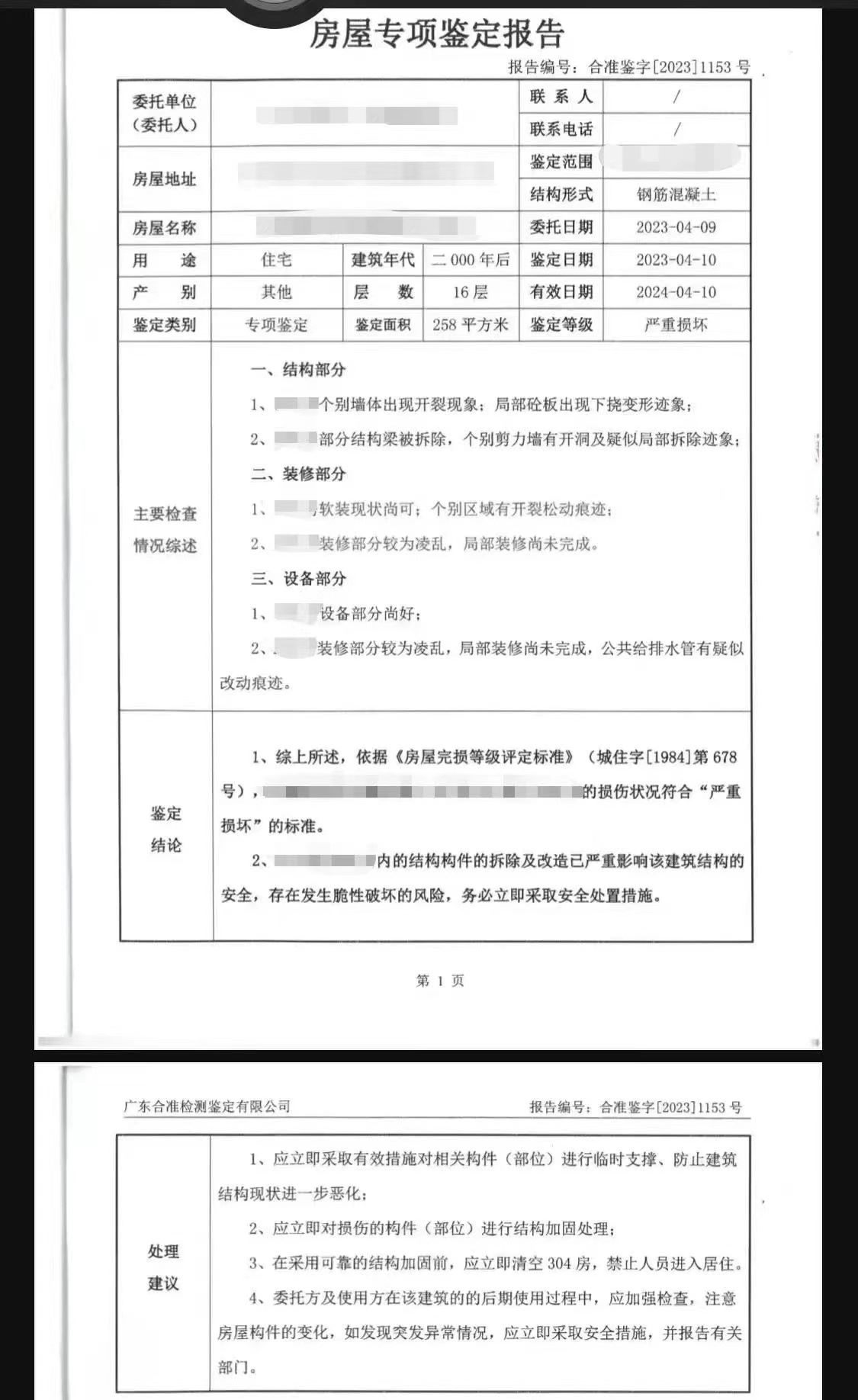 值得注意的是,發(fā)現(xiàn)204房的承重墻被拆后,有業(yè)主曾自費(fèi)請鑒定機(jī)構(gòu)對204房、304房進(jìn)行安全鑒定。鑒定結(jié)果顯示,涉事房屋的損傷程度符合“嚴(yán)重?fù)p壞”的標(biāo)準(zhǔn);在采用可靠的結(jié)構(gòu)加固前,應(yīng)立即清空304房,禁止人員進(jìn)入居住。而在5月5日,永平街道辦在涉事樓棟貼出“致廣大居民朋友的一封信”,其中提到:4月8日至18日,已經(jīng)完成了臨時加固支撐工程,目前建筑物整體結(jié)構(gòu)穩(wěn)定可控,人員無需轉(zhuǎn)移,但需要盡快加固補(bǔ)強(qiáng)。