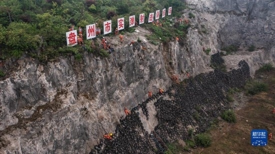 六盤(pán)水消防救援支隊(duì)隊(duì)員在進(jìn)行模擬高山峽谷救援演練(5月11日攝,無(wú)人機(jī)照片)。