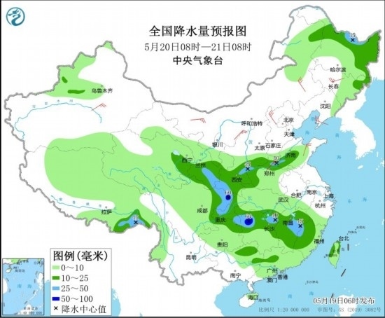 全國(guó)降水量預(yù)報(bào)圖(5月20日08時(shí)-21日08時(shí))。圖片來源:中央氣象臺(tái)網(wǎng)站