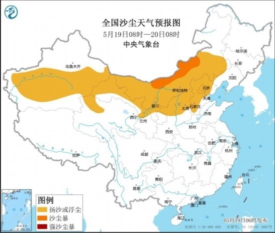 全國(guó)沙塵天氣預(yù)報(bào)圖(5月19日08時(shí)-20日08時(shí))。圖片來源:中央氣象臺(tái)網(wǎng)站