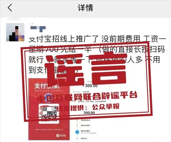 真相:近日,有網民向支付寶開放平臺反饋,看到有打著“螞蟻推廣”或“支付寶推廣”等旗號,聲稱“出租朋友圈可以賺取100/天”的推廣任務。對此,支付寶辟謠稱,此類活動均為詐騙,請勿輕信。