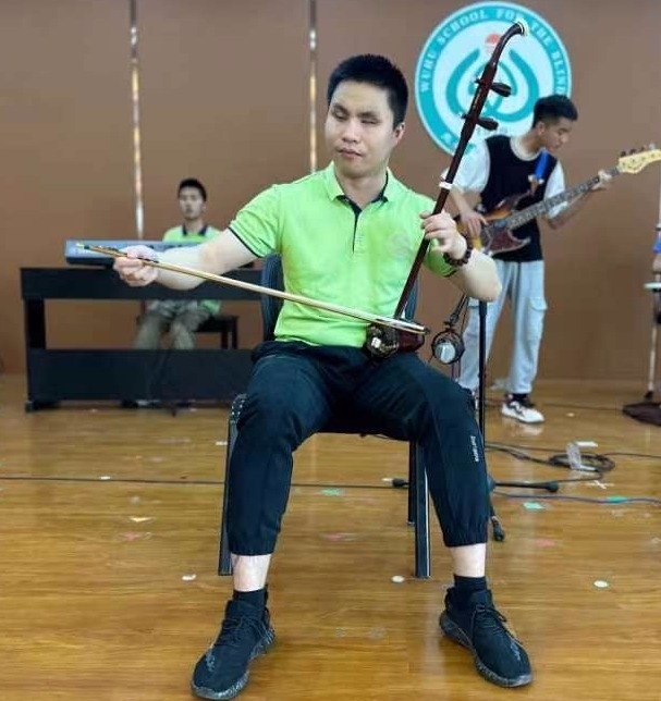 “學生看不見,我也看不見,我就只能抓著他們的手,手把手教?!瘪液茘拐f,這些年,為了教學生演奏樂器,他什么方法都試過了,唯獨沒試過放棄。