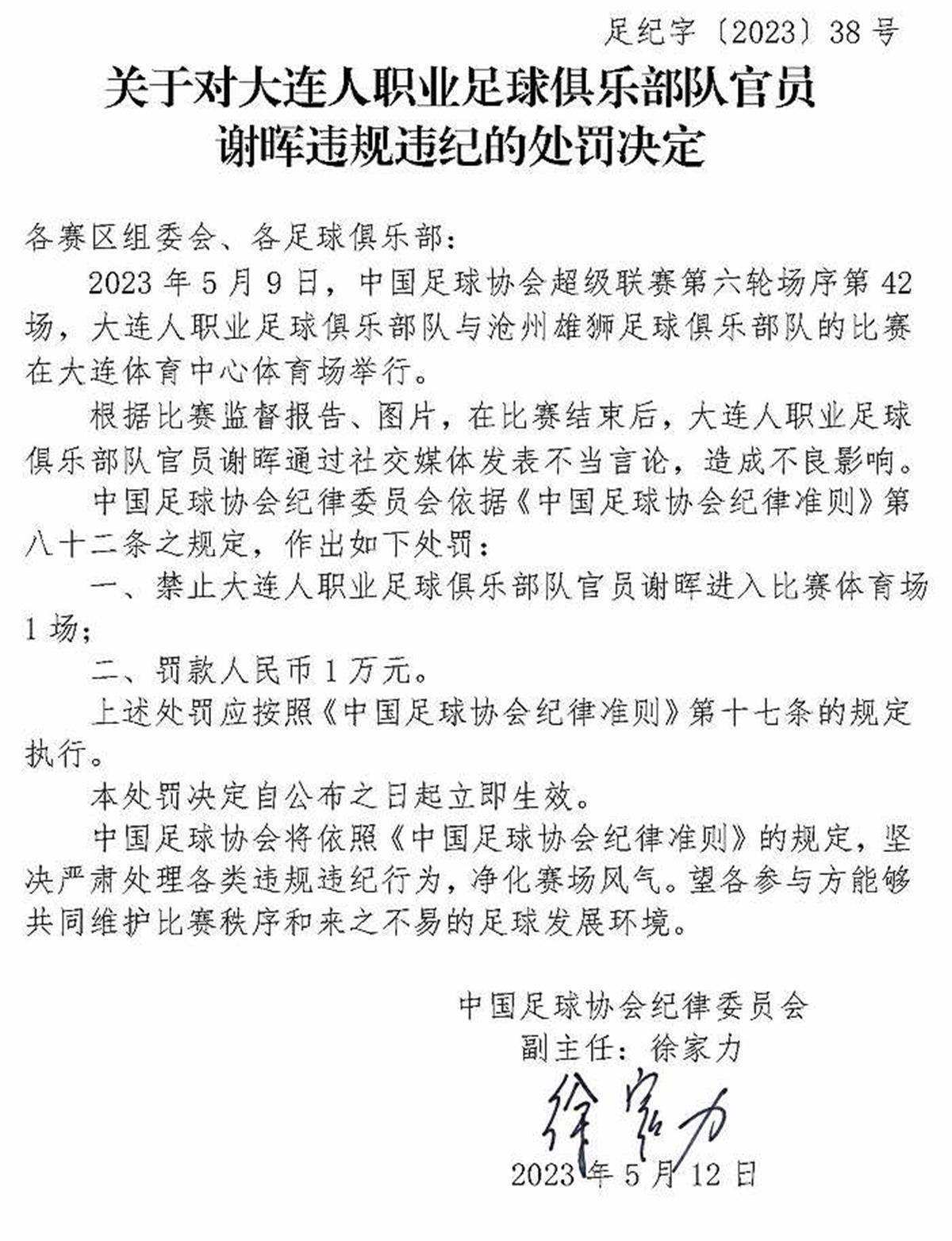 5月12日,中國足協(xié)紀(jì)律委員會(huì)接連開出三張罰單,對中超大連人隊(duì)的主教練謝暉,以及南通支云隊(duì)、黑龍江冰城隊(duì)的兩位俱樂部官員范兵和李鎮(zhèn)伯進(jìn)行了處罰,共計(jì)罰款5萬元,并對三人追加禁賽。這三張罰單一出,引來外界的一片質(zhì)疑聲。