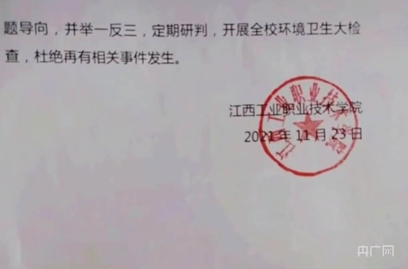 情況通報(bào)還提到,南昌市高新區(qū)市場監(jiān)督管理局接到情況報(bào)告后,第一時間派出執(zhí)法人員到江西工業(yè)職業(yè)技術(shù)學(xué)院開展調(diào)查,問詢學(xué)校工作人員、食堂負(fù)責(zé)人、當(dāng)事學(xué)生及相關(guān)知情人,對食品留樣進(jìn)行采樣檢測。