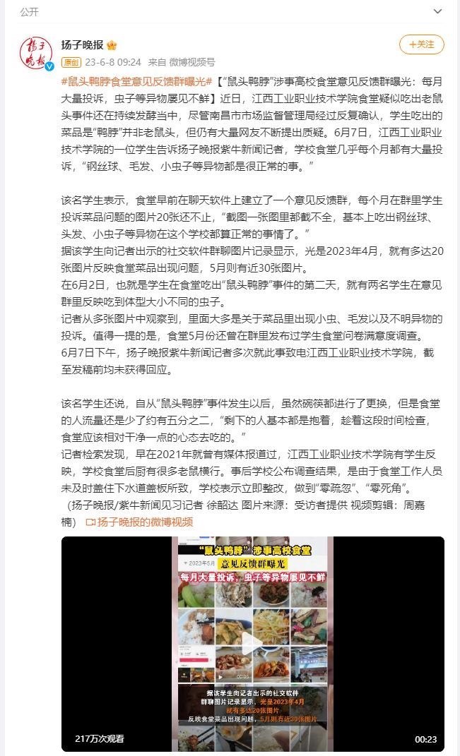 ·“鼠頭鴨脖”涉事高校食堂意見反饋群曝光:每月大量投訴,鋼絲球、毛發(fā)、蟲子等異物屢見不鮮。