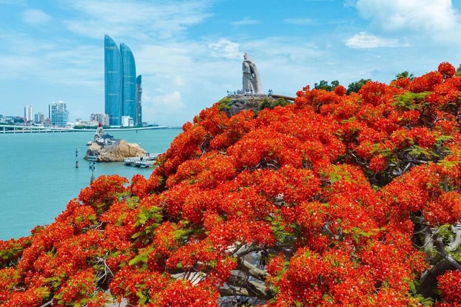 廈門鼓浪嶼上鳳凰花盛開,灼熱的陽光灑向鳳凰木枝頭,光影斑駁,滿眼盡是艷麗的橙紅色,映照出夏日的動(dòng)人景致。
