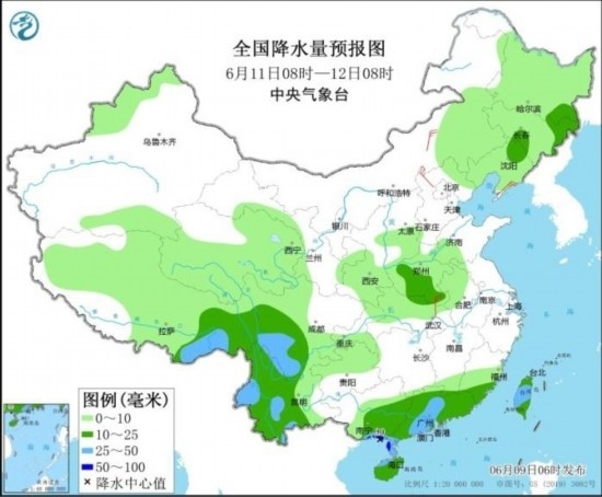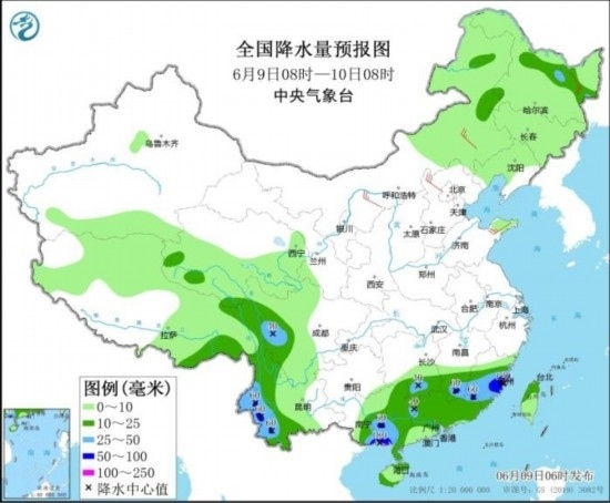 9日至11日,江南、華南、云南等地有中到大雨,局地有暴雨或大暴雨,小時(shí)雨量20~50毫米,局地可達(dá)60毫米以上;預(yù)計(jì)6月9日08時(shí)至10日08時(shí),廣西南部和東北部、湖南南部、江西南部、福建中南部、廣東西北部、云南西部、四川西部等地部分地區(qū)有大到暴雨,其中,福建東部沿海、廣西東南部沿海等地局地有大暴雨(100~180毫米)。上述部分地區(qū)伴有短時(shí)強(qiáng)降水,局地有雷暴大風(fēng)或冰雹等強(qiáng)對(duì)流天氣。中央氣象臺(tái)6月9日06時(shí)繼續(xù)發(fā)布暴雨藍(lán)色預(yù)警(見(jiàn)圖1)。