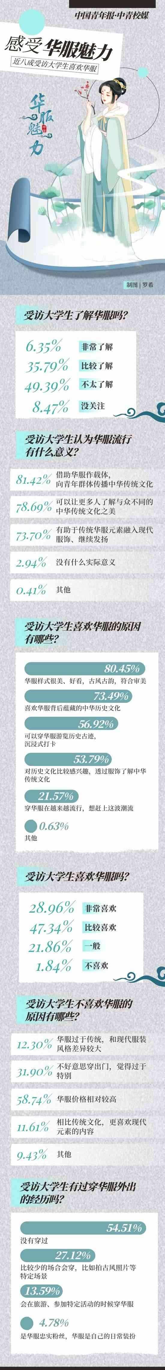 穿華服正在成為一些年輕人旅游或日常出行的選擇。“華服”,是指具有中華民族歷史文化基因、精神風(fēng)貌,且融合當(dāng)代審美的禮儀性服裝,其服裝風(fēng)格根植于中華傳統(tǒng)文化,傳承中華民族特質(zhì),體現(xiàn)當(dāng)代社會(huì)積極向上的時(shí)代精神,具有鮮明的辨識(shí)度,適用于國際交往、文化交流、商貿(mào)往來以及日常節(jié)慶、典祭等禮儀場(chǎng)合。自2018年起,每年的農(nóng)歷三月初三被選定為“中國華服日”,在前不久結(jié)束的第五屆“中國華服日”活動(dòng)中,上萬名青年華服愛好者匯聚活動(dòng)現(xiàn)場(chǎng)參與體驗(yàn)。近日,中國青年報(bào)社·中青校媒面向全國高校大學(xué)生發(fā)起問卷調(diào)查,共回收117所高校學(xué)生填寫的有效問卷1464份。調(diào)查結(jié)果顯示,76.30%受訪者表示喜歡華服,42.14%受訪者表示對(duì)華服有一定的了解。