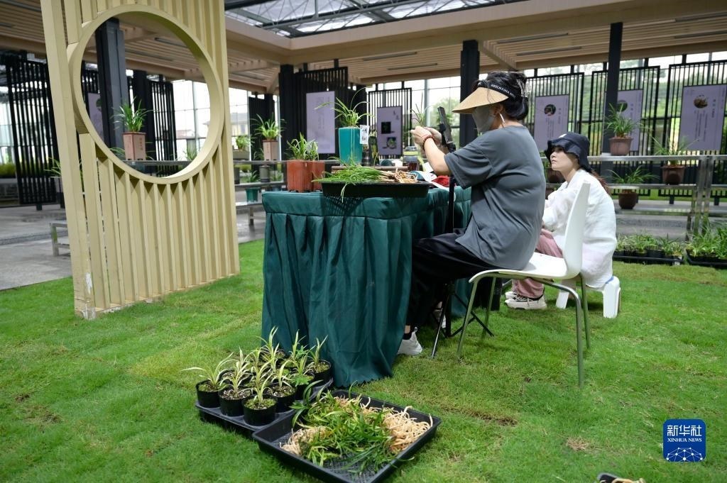 6月8日,在浙江省紹興市柯橋區(qū)漓渚鎮(zhèn)棠棣村的蘭花數字工廠,一位游客觀看花卉。新華社記者 才揚 攝