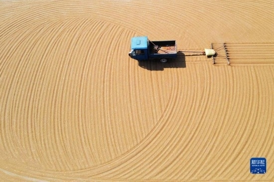 6月9日,江蘇省淮安市淮安區(qū)白馬湖農(nóng)場工人在晾曬小麥(無人機照片)。