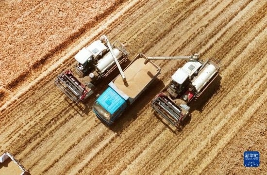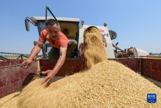 6月9日,農(nóng)民在山東省膠州市洋河鎮(zhèn)黃墩后村田間收獲小麥。