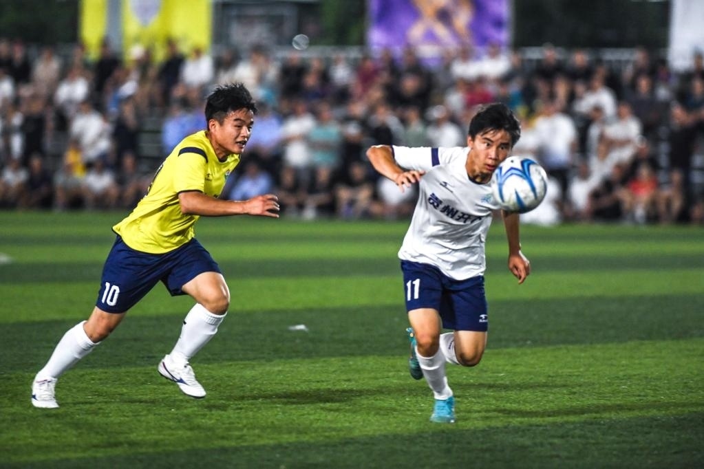 6月9日,貴州開(kāi)放大學(xué)足球隊(duì)球員與榕江足球代表隊(duì)球員(左)在友誼賽中拼搶。新華社記者 楊文斌 攝