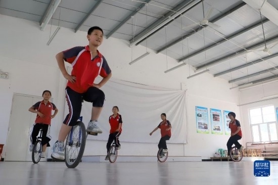 6月15日,在河北省滄州市吳橋縣馬庫吏小學(xué),學(xué)生練習(xí)雜技獨(dú)輪車。