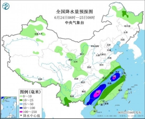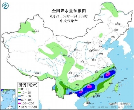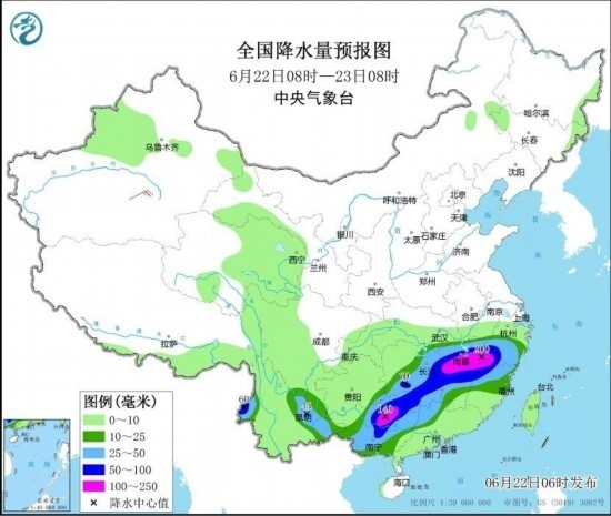 圖3 全國降水量預(yù)報圖(6月22日08時-23日08時) 圖自中央氣象臺網(wǎng)站