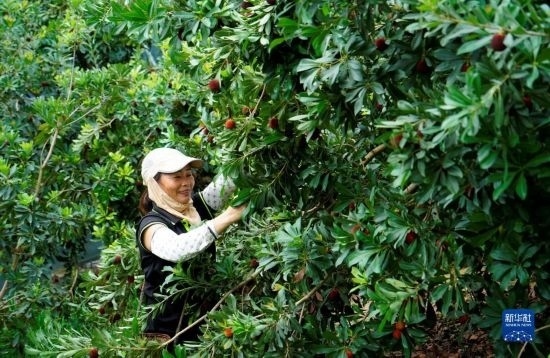 湖南省靖州苗族侗族自治縣渠陽鎮(zhèn)官團(tuán)村的果農(nóng)采摘楊梅(6月18日攝)。