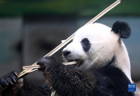 6月26日,“剛剛”在鞍山動(dòng)物園熊貓館里吃竹子。