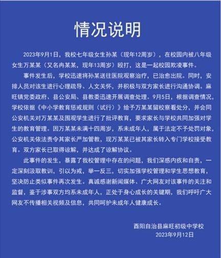 ·重慶酉陽(yáng)初中女生遭欺凌事件進(jìn)展:雙方達(dá)成諒解協(xié)議,打人者已被轉(zhuǎn)入專(zhuān)門(mén)學(xué)校接受教育。