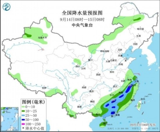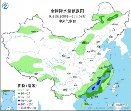 全國降水量預(yù)報(bào)圖(9月13日08時(shí)-14日08時(shí))