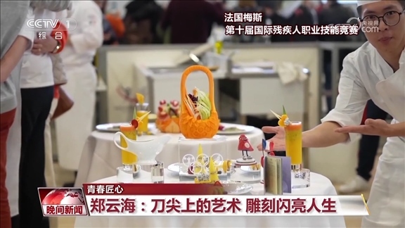 功夫不負有心人,鄭云海的雕刻技藝不斷精進,他也開始自主設計創(chuàng)作作品,并斬獲了多項國內(nèi)比賽冠軍。今年3月,在法國梅斯舉辦的第十屆國際殘疾人職業(yè)技能競賽食品雕刻項目比賽中,他奪得金牌,成為食品雕刻屆的世界冠軍。