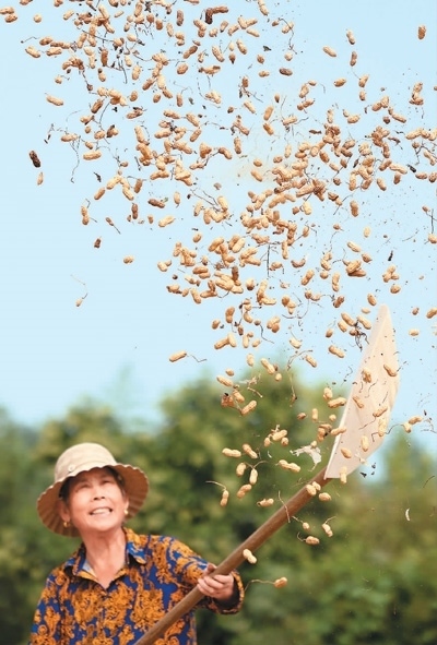 山東省棗莊市市中區(qū)稅郭鎮(zhèn)沙溝村,農(nóng)民在揚(yáng)曬花生。 孫中喆攝(人民視覺) |