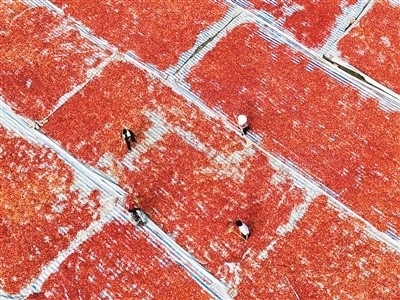 安徽省亳州市譙城區(qū)雙溝鎮(zhèn)任小廟村,農(nóng)民在晾曬剛采收的辣椒。 劉勤利攝(人民視覺) |