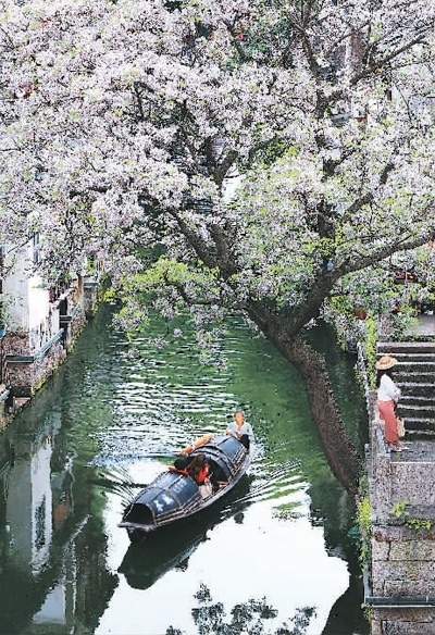 夕陽(yáng)的余暉灑在寶珠橋上,烏篷船從拱形橋洞中悠然而過(guò),河面蕩起層層漣漪。幾名身著漢服的姑娘在橋頭觀景、拍照,笑語(yǔ)連連。