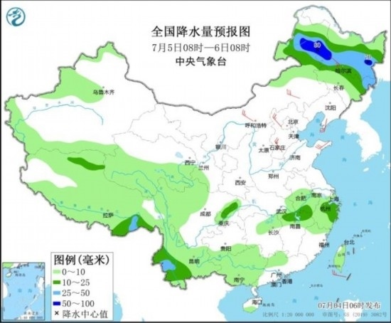 7月5日08時至6日08時,內(nèi)蒙古東部、黑龍江中南部、吉林北部、云南西部和南部、江西北部、浙江北部等地部分地區(qū)有中到大雨,其中,內(nèi)蒙古東北部、黑龍江西南部等地局地有暴雨(50~80毫米)。內(nèi)蒙古、黑龍江、遼東半島、河北等地部分地區(qū)有4~6級風。