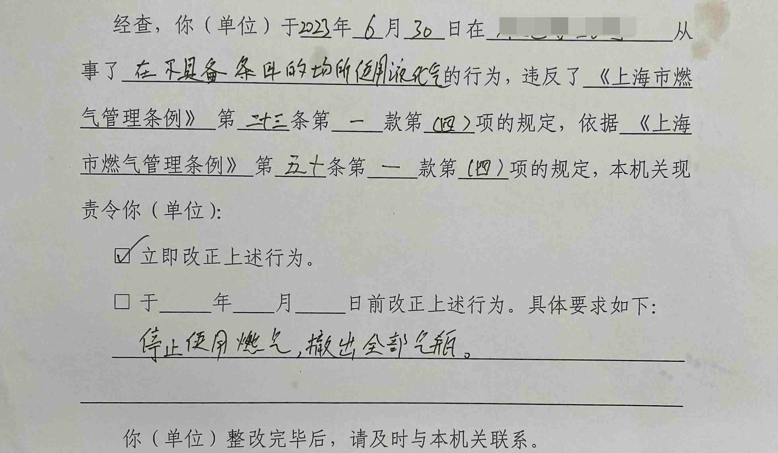 這并不是一次平常的燃氣用完后更換空瓶。大概一個小時前,市住建委相關部門的檢查人員走進餐館,檢查后責令整改,并在整改完成前暫停燃氣供應。