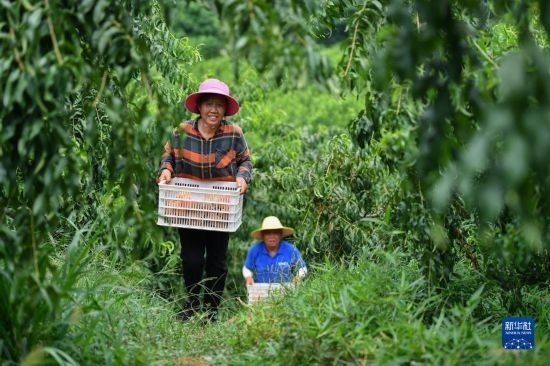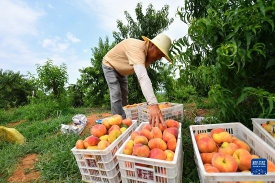 7月7日,在臨湘市聶市鎮(zhèn)乘嶺社區(qū)的涓湖果園,果農(nóng)在搬運(yùn)蟠桃。