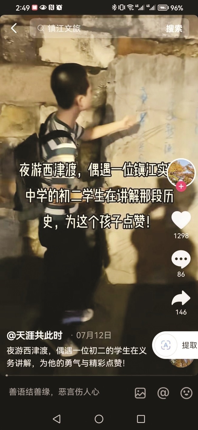 揚(yáng)子晚報(bào)訊(記者 萬凌云 通訊員 湯婉蓉 孫冬)“人類的歷史與功績會隨著時間而消失。但是中國將在他們身上繼續(xù)存在,我們將保持他們高舉的旗幟……”7月22日,一段鎮(zhèn)江初中學(xué)生講解歷史的視頻爆火,他們的講解地位于歷史底蘊(yùn)深厚的鎮(zhèn)江西津渡景區(qū)。